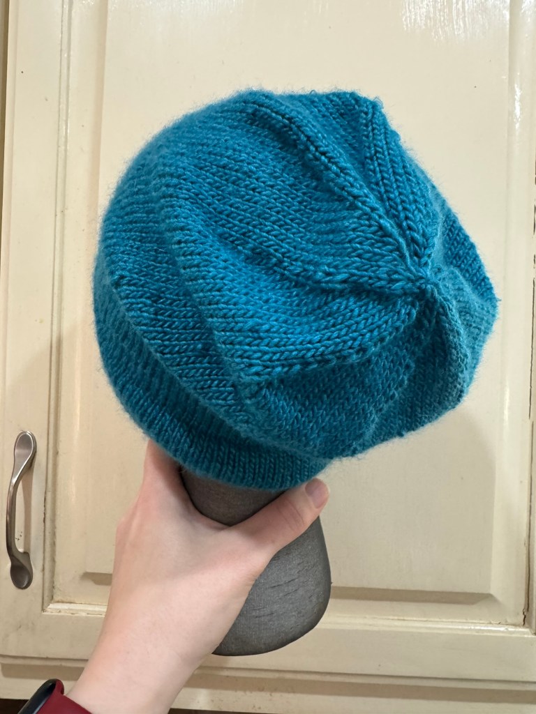 The hat came out blocked to an adult medium size or large child. I think I will let my teal loving PB have this hat for school use. I won’t be sad if this one gets lost along the way. It will have served its purpose 🙂