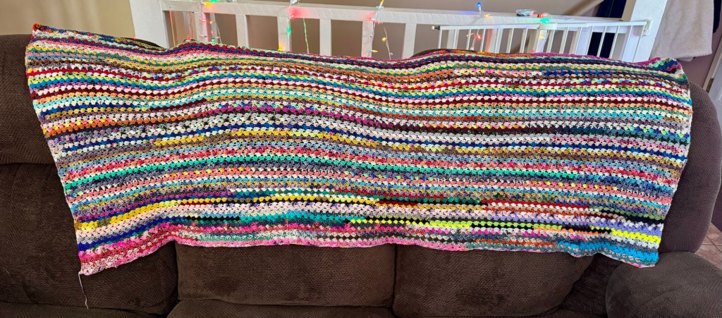 As a Valentines Treat to myself, I pulled out my Super Scrappy Granny Stripe Blanket. I have put little bits and bobs on but I haven’t spread it out in a long while.