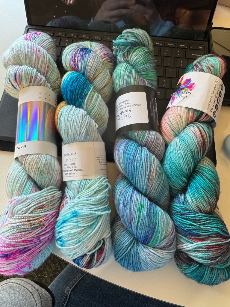 I have four colors where the pattern only has three. I am still deciding if I want to adapt the pattern to work with four colors or cull one of these and just do the three. I think I will get these wound up and play with it for awhile before casting on.