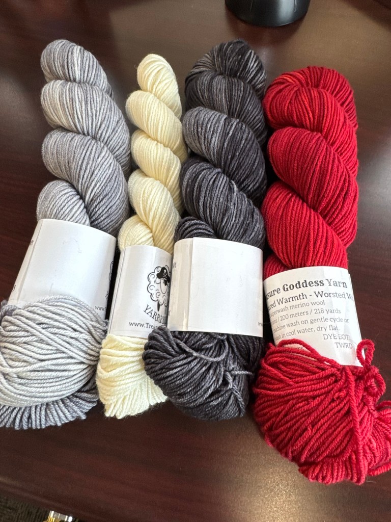I got the Raiders kit which is the Pieces of Eight (grey), White Sand Beaches (white) and Gunpowder (black) to make the hat. I even lucked out because she didn’t have a half skein of the light grey and threw in a full one instead. She really is the best.