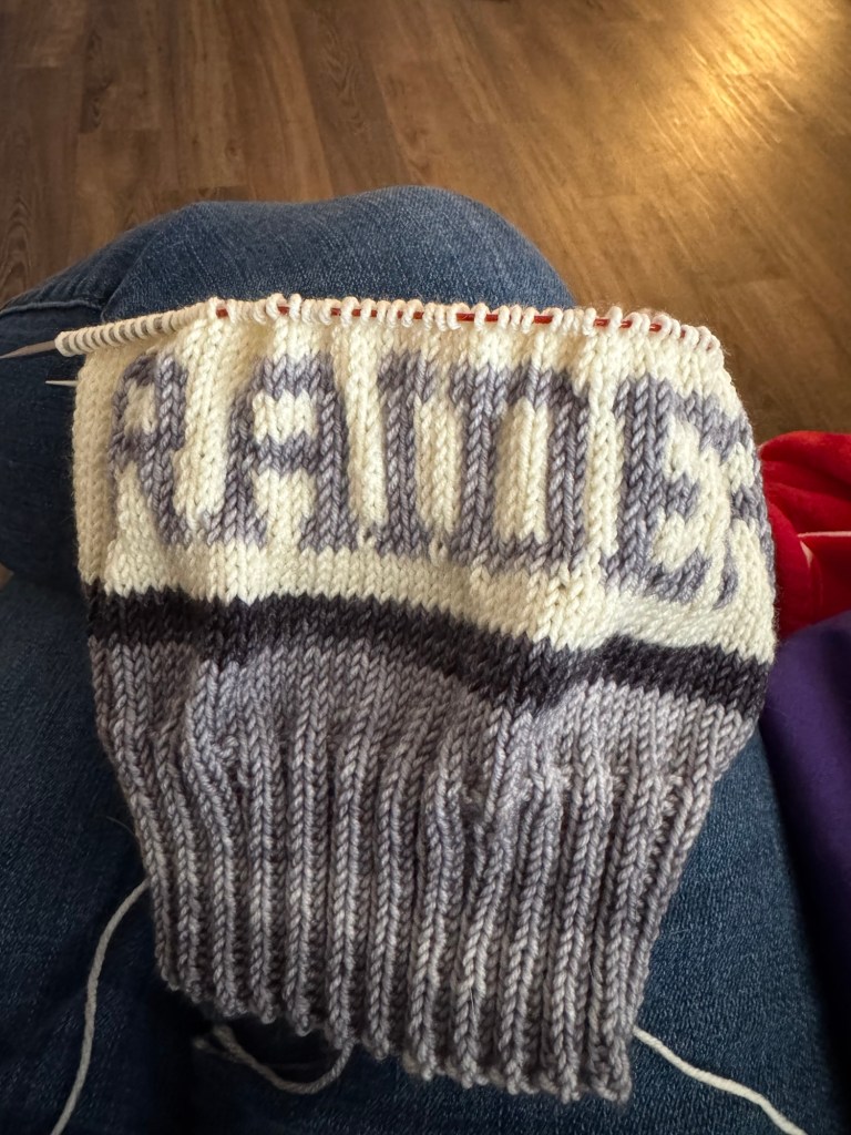 Now that it is done, I do wish I had done the letters in the black yarn and not the grey. The grey looks fine but it doesn’t ‘pop’ like the black would have. And it doesn’t bother me enough to rip it back and redo it. So now I just need to finish the crown to be done.