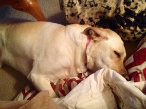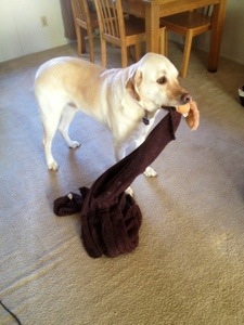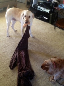 Dex has been pulling out ALL his toys and blankets and leaving them EVERY WHERE. Let me tell you it’s a joy to find the sharp edge of a nylon chew bone on the way to the bathroom with your bare foot at 3 am. I can’t blame the poor pup for being cooped up this winter, but he’s wearing on my nerves!