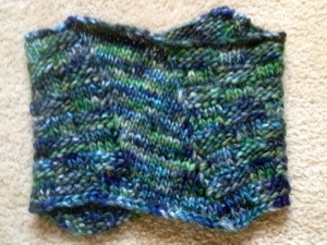 I searched Ravelry and finally found something that tripped my trigger so to speak! I found Wonky by Brittany Wilson, a creative one skein cowl. It is knit in the round and the decreases and increases cause it to come out in a zig zag shape….or wonky!