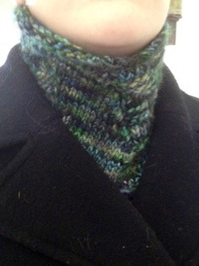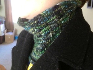 It looks really nice against my black wool coat. The yarn isn’t the softest but its very warm! It felt good during our trip to the dog park today as its 30 degrees here!
