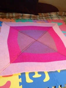 I finished the knitting portion on Aunt Martha’s Prayer blanket on our trip to Arkansas this past weekend, but didn’t get get it washed until Sunday night. Its amazing what you can accomplish with 8 hours if driving time! It’s currently blocked and drying on my guest bed to open up the eyelets and take some of the curl out.