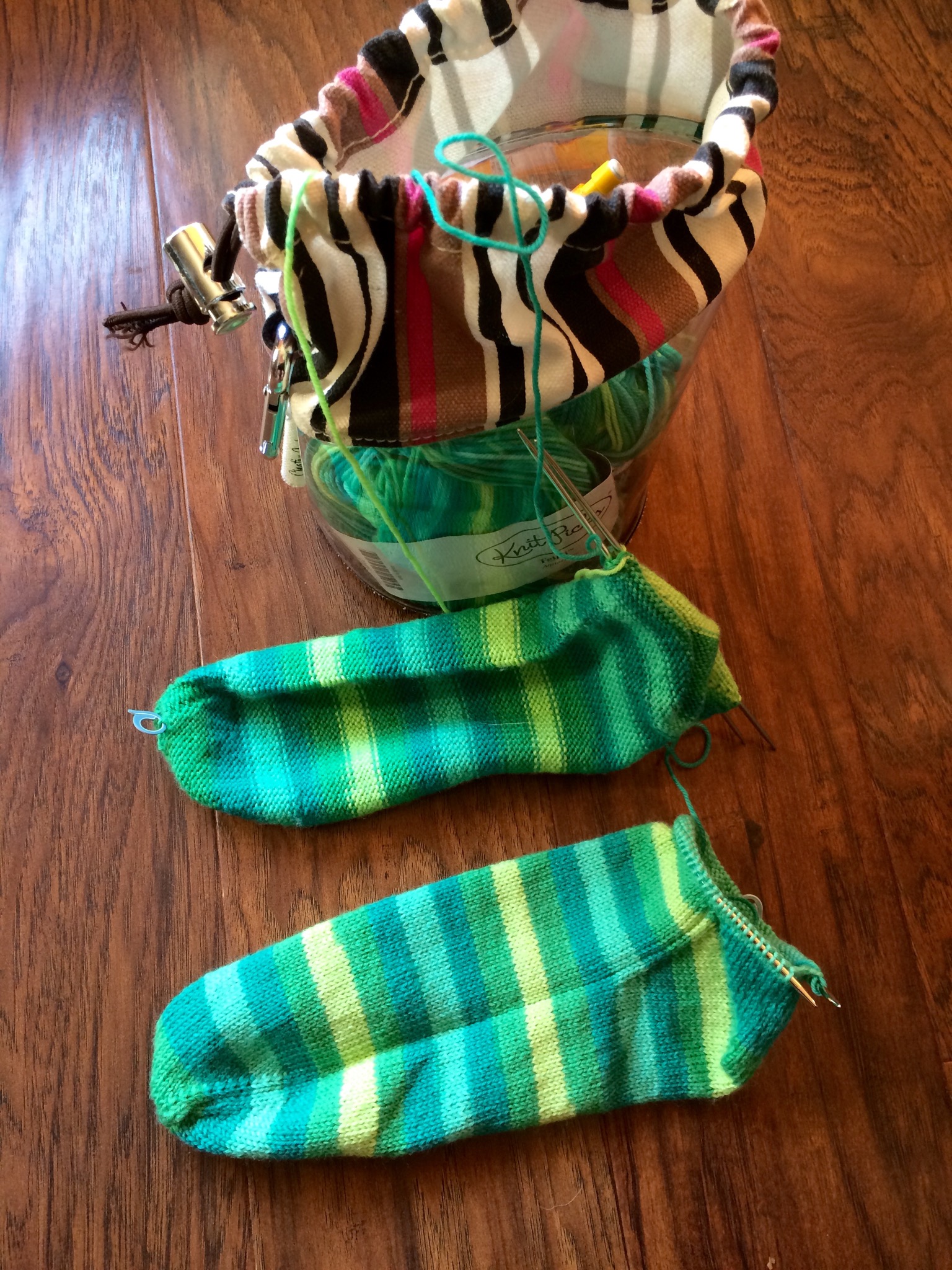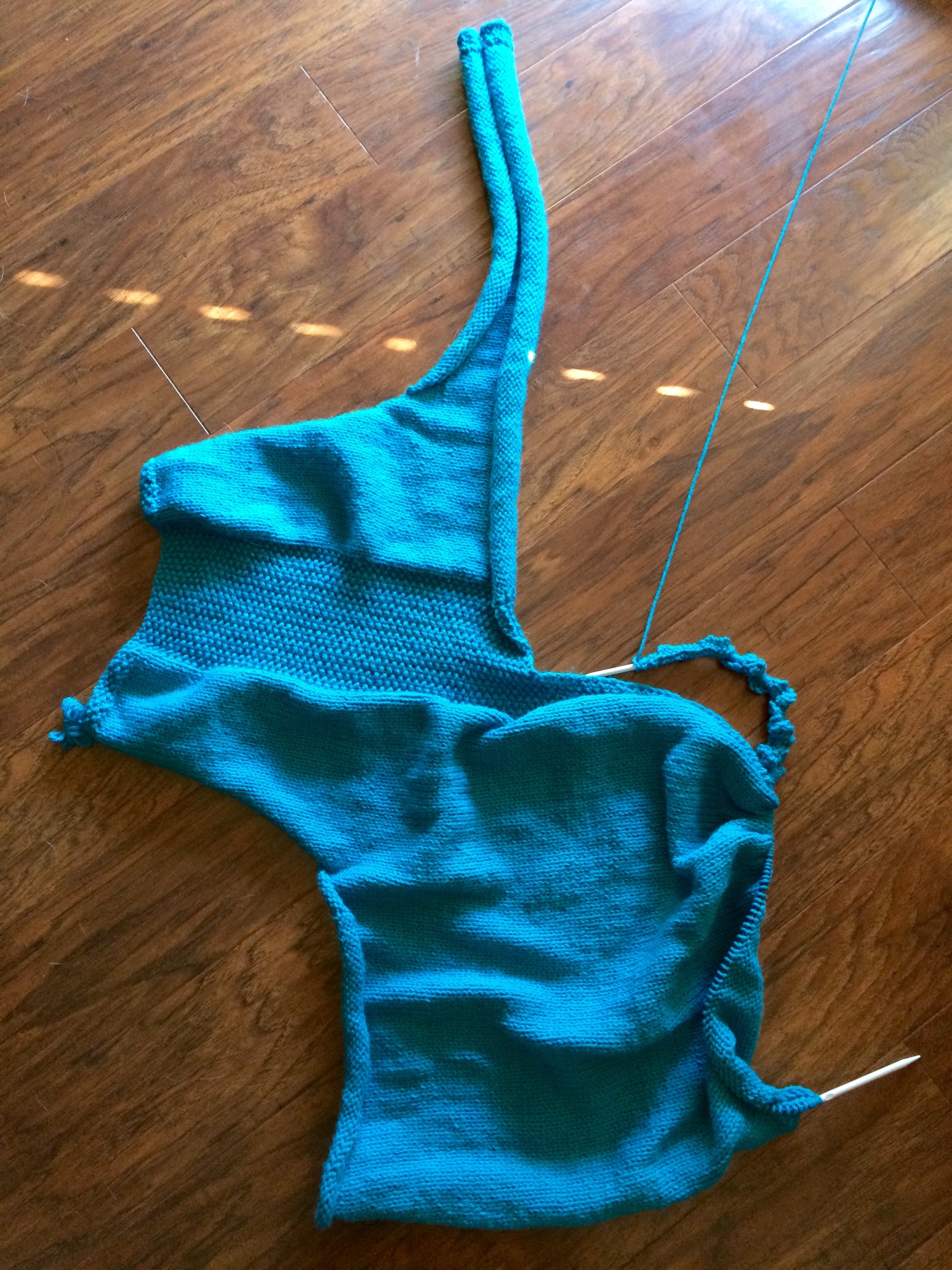 This is an interesting construction. It’s worked side to side. I’ve completed the first sleeve, one front, and the back. Now I’m on to the second front. The stockinette is very curly and I’m concerned this is going to be small. But I believe in the pattern and my search. Blocking is indeed miraculous! I have faith 🙂