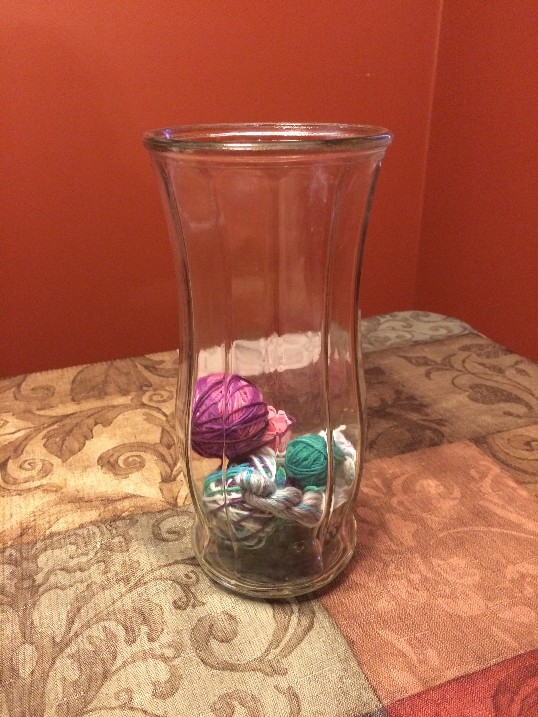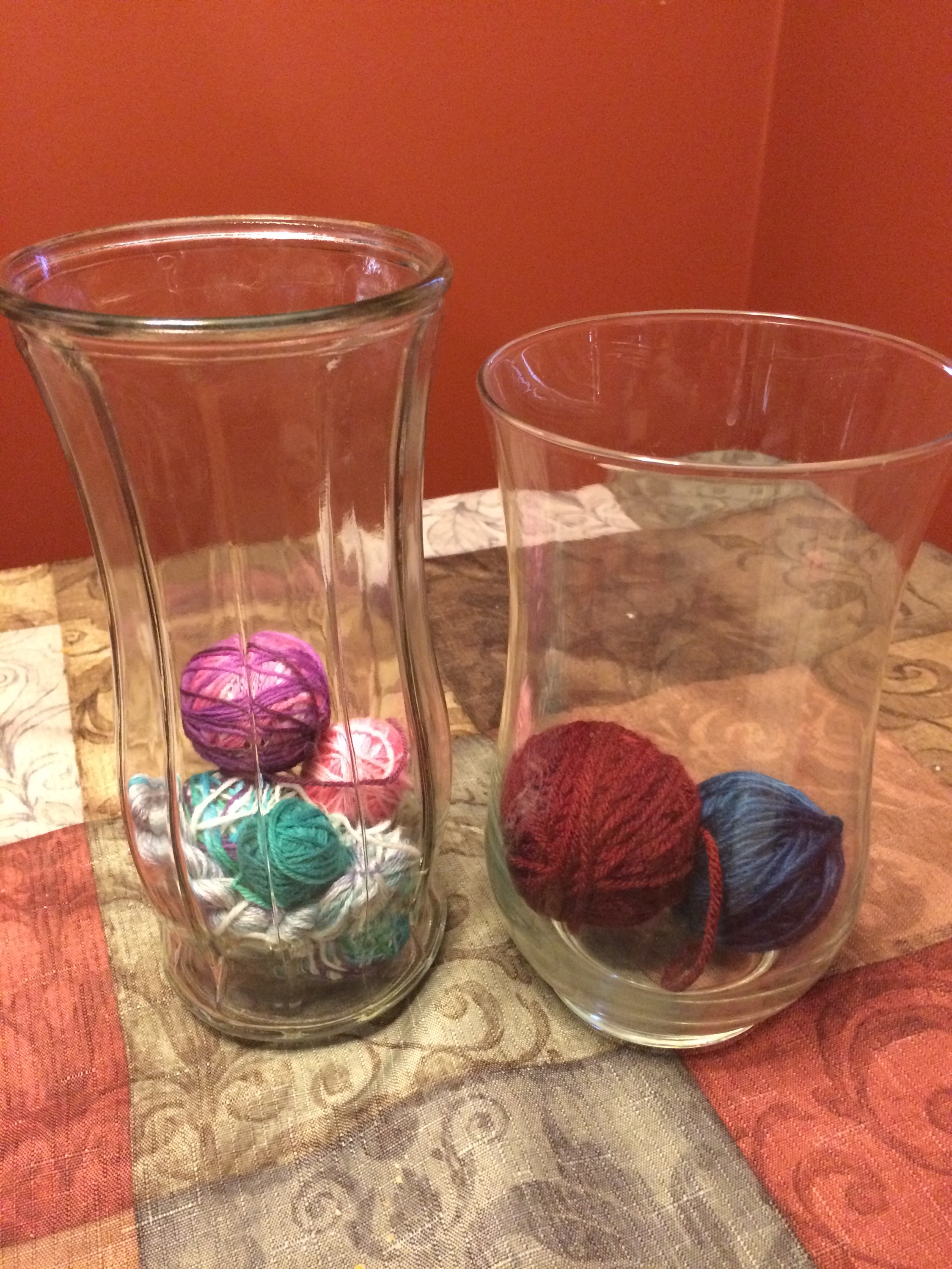 Eventually these will fill up and I’ll have pretty vases full of yummy yarn bits. The hope is that I’ll always be able to find sock yarn for sock repair or perhaps a scrap project sometime. Not to mention something I can dig my hands into and pet the lovelies 🙂