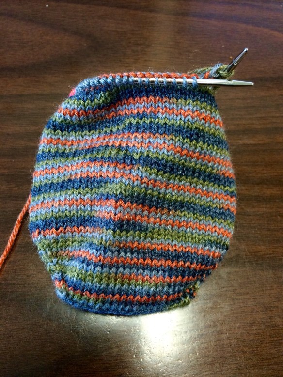 This pair is going to be a toe up vanilla with afterthought heel since I have two full skeins. Above is my progress just this morning. Being able to knit makes me both love and hate training, lol.