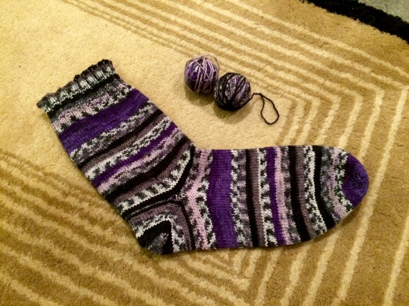The cutting meant I was disrupting the stripe pattern. I salvaged as far as I could and knit till I ran out of yarn without messing up the order. Those two tiny balls are the remainder of the skein. It’s still a proper sock but shorter than I had planned.