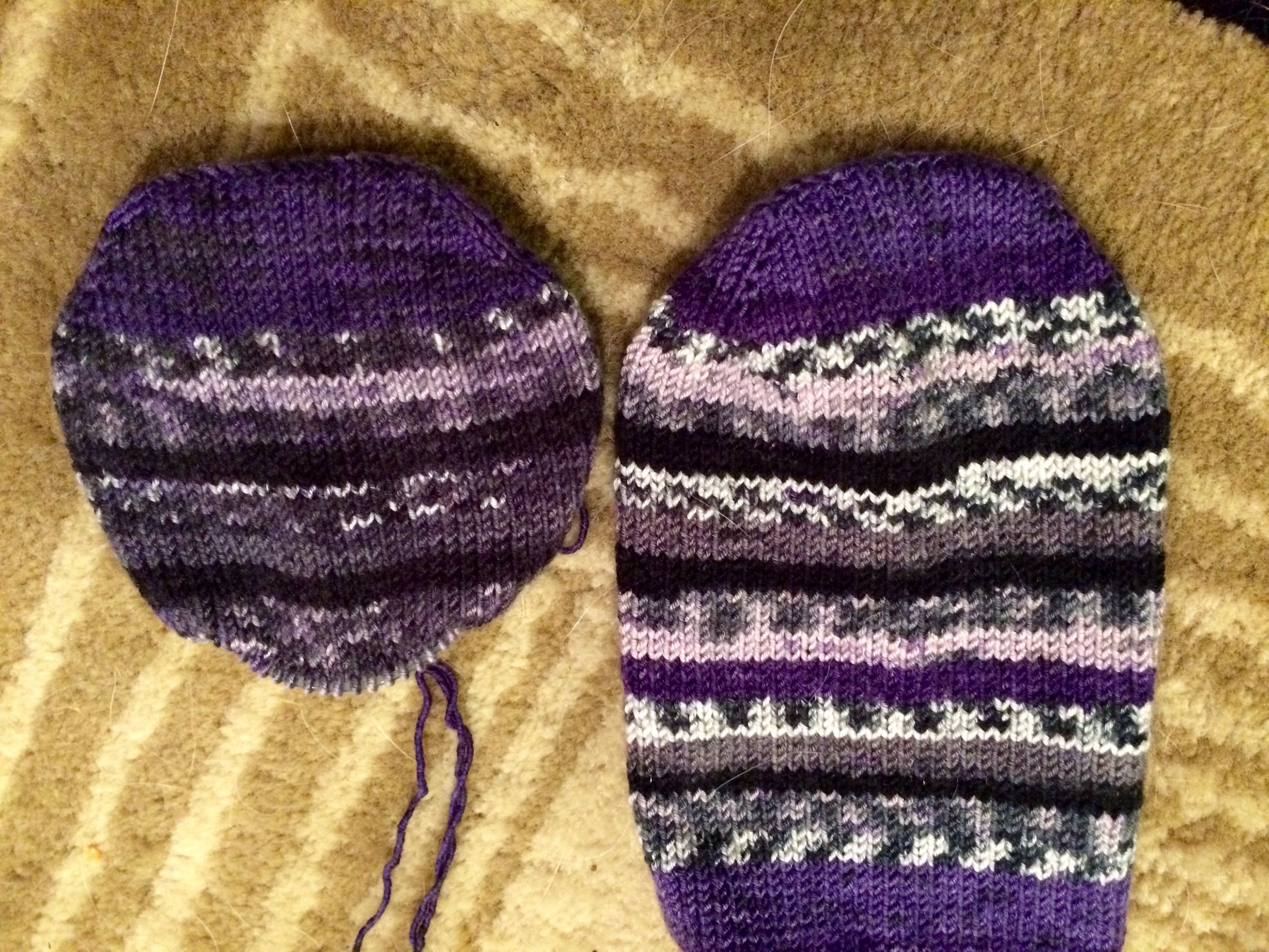 Two drastically different dye lots! The second is much more muted and I do so love the first sock. I’m still forging ahead as the color difference won’t affect how warm they are. This is what I get for not checking the dye lots of the sale bin, lol.