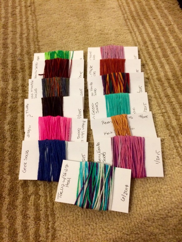 That my friends is my entire sock history all neatly laid out in one pile. I took some old business cards and my pile of sock leftovers and went to town. Each card holds several yards of yarn neatly labeled by date, project name, and yarn name. These cards will be stored in a file card box in case of darning or other necessary sock repair. All the rest of my leftovers went into a baggy for a future leftover project.