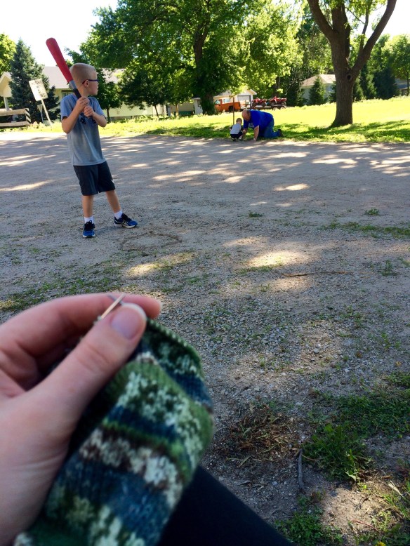 Lots of dirt and little boys learning baseball! (Jellybean and Grandpa and in the background playing with bugs instead of 3rd base.) And the project is my Camo Vanilla Socks for my dad for Christmas. I hope to get a proper post about them this week but until then…Happy Knitting!!