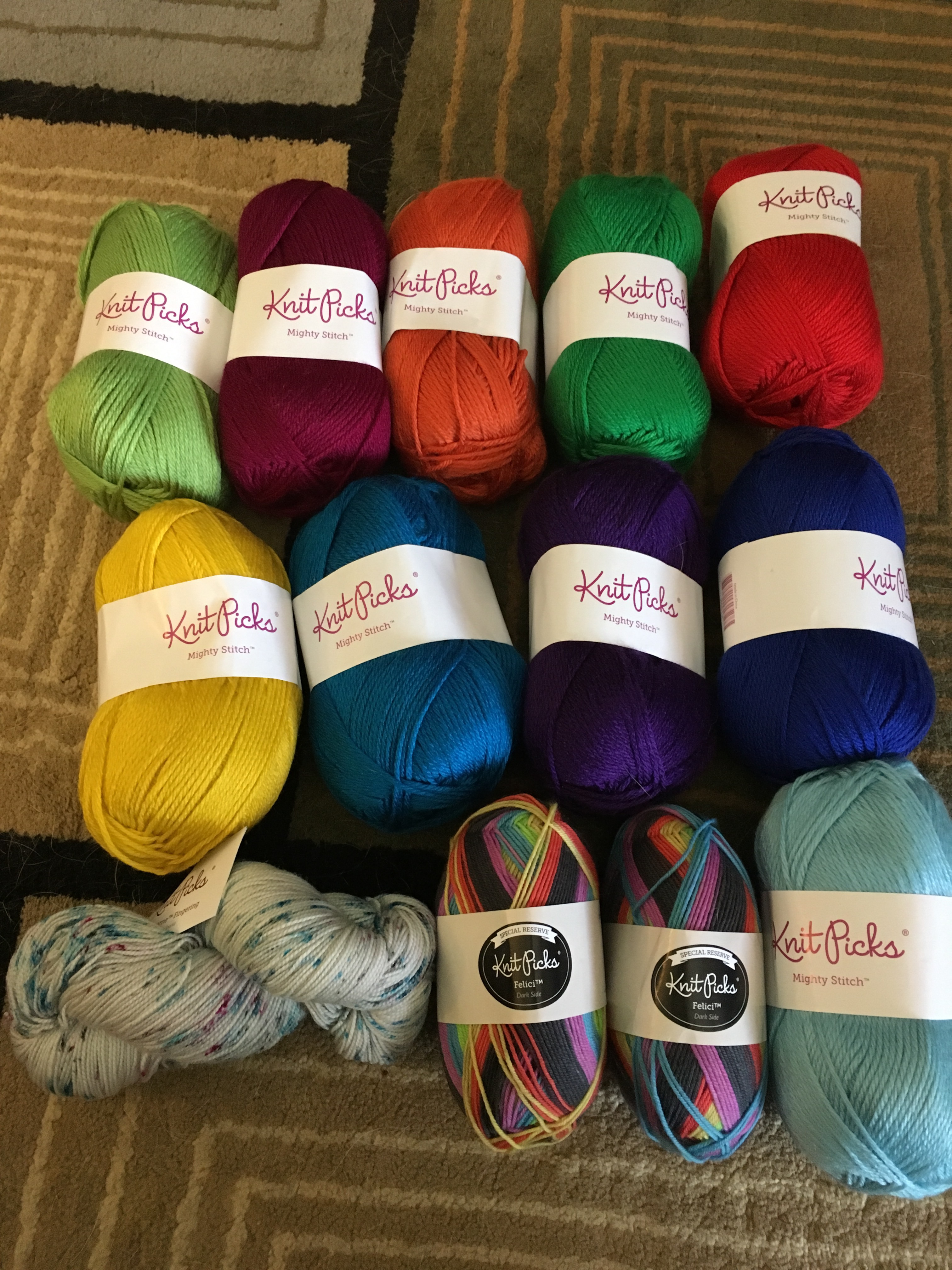 After wallowing in my recent germy funk my keyboard just took itself to Knit Picks. I’ve been ITCHING to make the Might Rainbow blanket from KP Mighty Stitch. And I decided to treat myself and some sock yarn (Felici and Hawthorne) might have fallen in to my cart too.