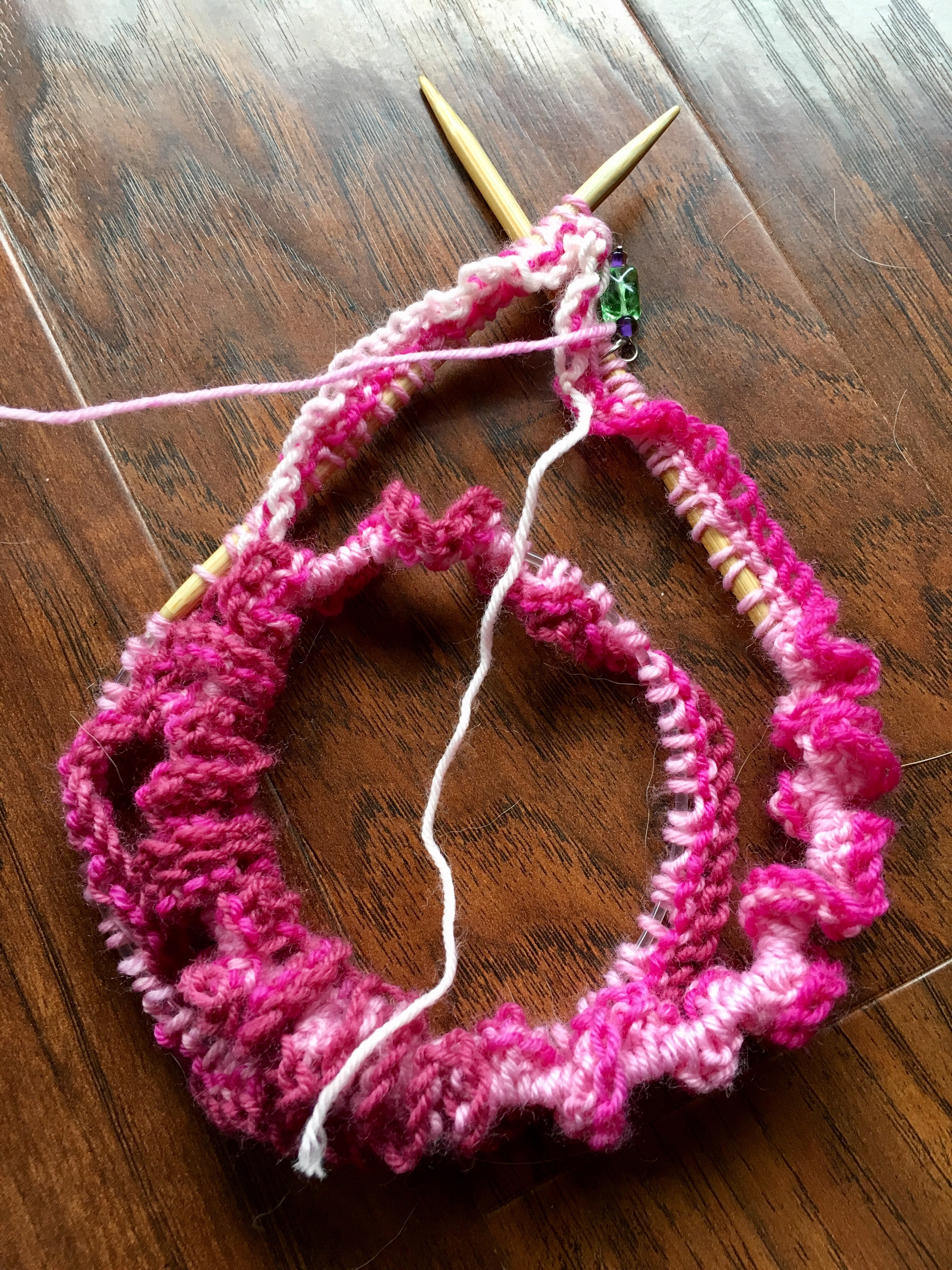 I saw on the Ravelry boards for the Down Cellar Studio Pigskin Party KAL that the November interception involved self striping yarn…..but not socks! Well I went digging in my stash for some of those lingering single skeins of self striping sock yarn. What better way to stash bust and earn extra KAL points. After careful consideration I pulled a skein of Knit Picks Felici in the Sweetheart color. A really nice mix of pinks that I chose because it made me happy.