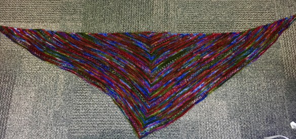 This is my Old Man of Storr shawl from my Mothers Day 2016 cast on. I think last we spoke I had started the last section? Yeah, I had to rip that back out. I don’t know what happened but my eyelets were off. Harrumph!