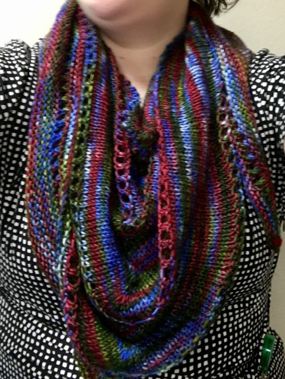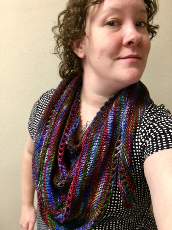 It’s 63 inches across and 22 inches deep. As you can see above from my atrocious selfies above that it wraps comfortably around my neck. My mother has been side eyeing this project since I started and so this might be her Christmas present. She spoils me so she is definitely knit worthy!