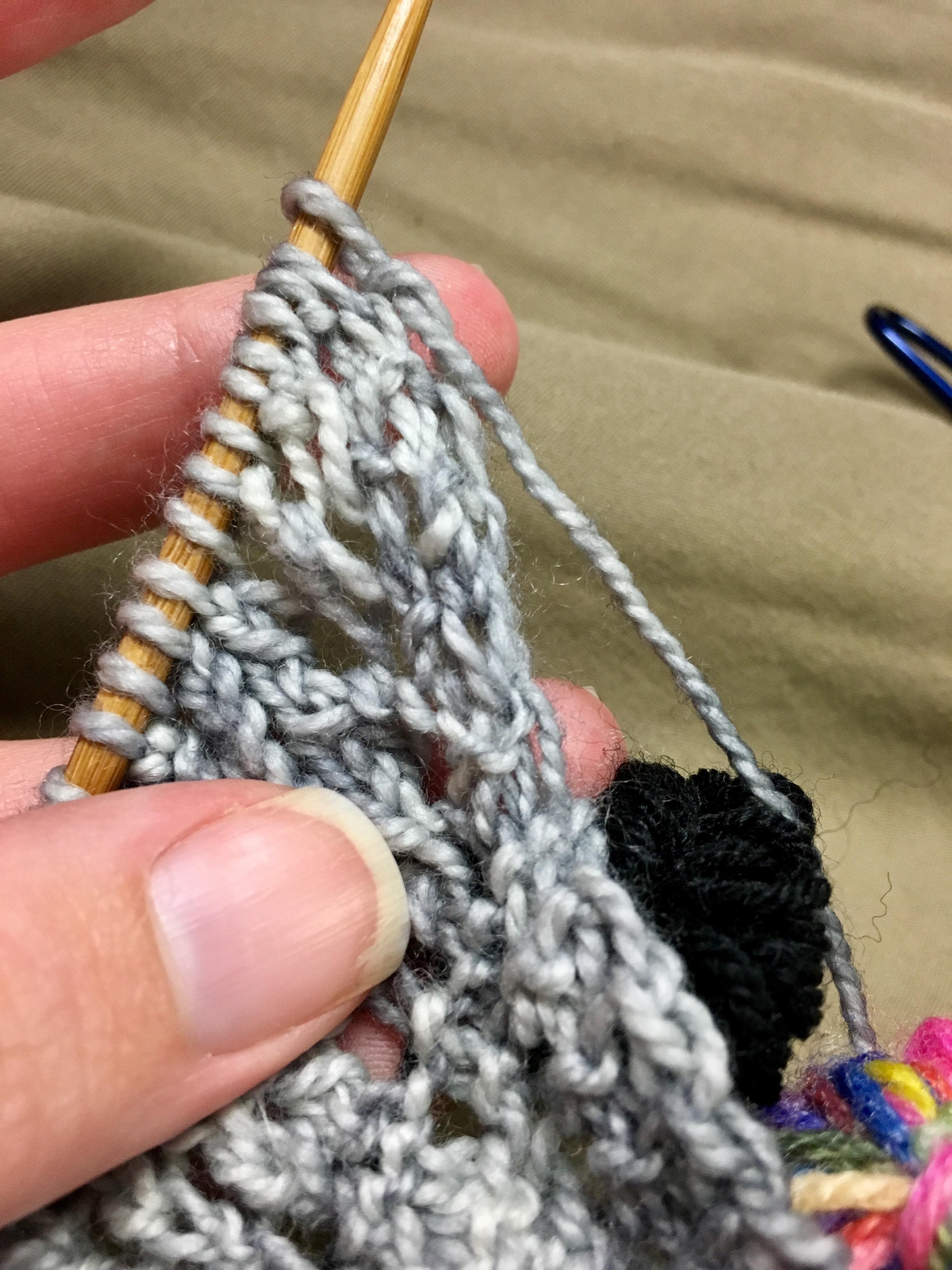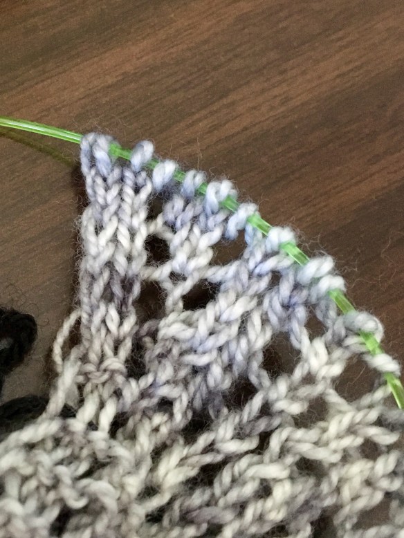 I accidentally did a stockinette edge instead of garter like the rest of the shawl. Guess what I managed to do again?? Yep, totally did it twice in a row. That’s what I get for going weeks in between working on this project. I am NOT ripping back again. I decided to find 20 minutes of toddler free time and try to drop down and fix it.