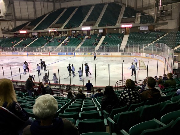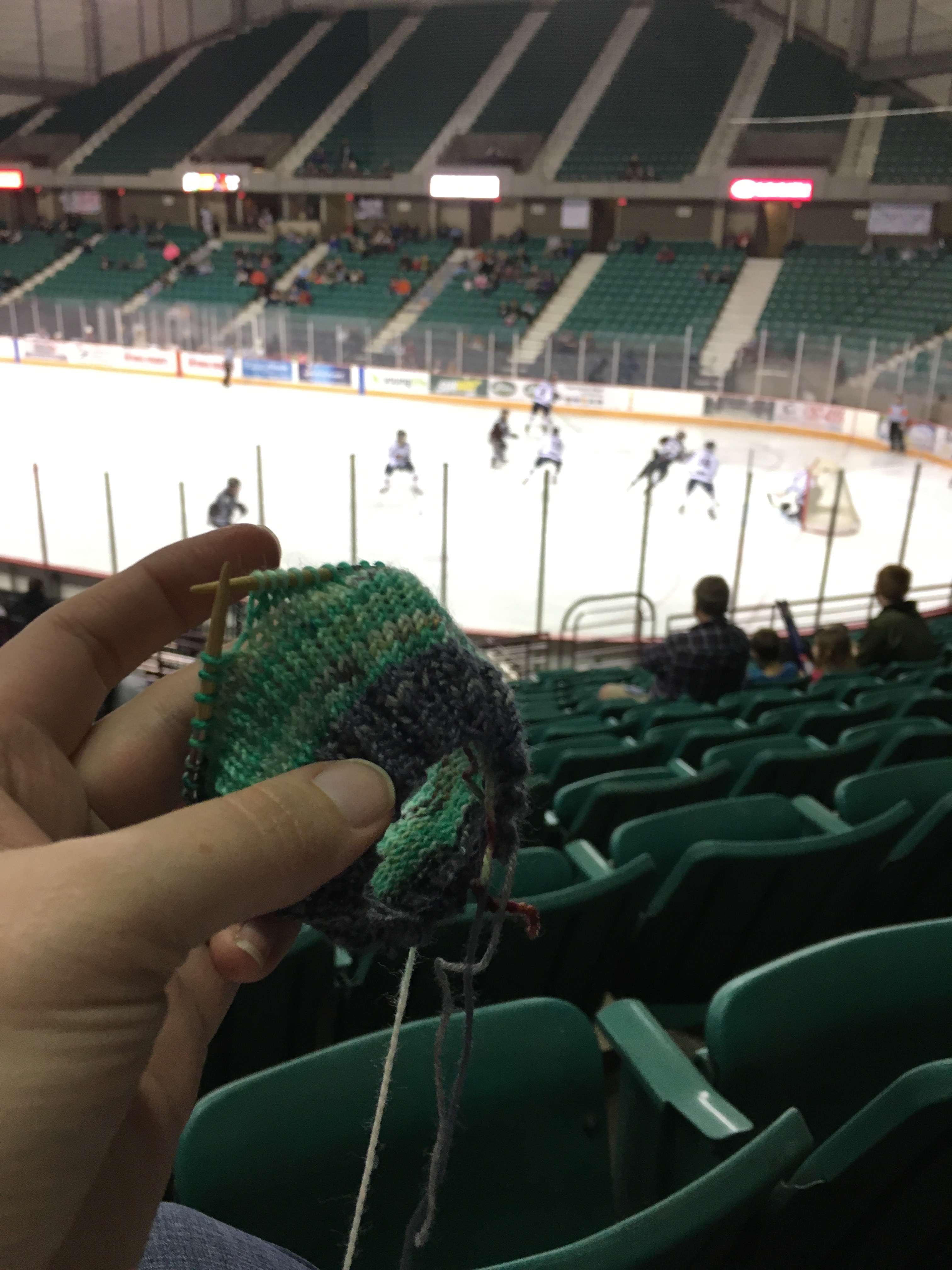 The husband and I scored free tickets to a local minor league hockey team, The Topeka Roadrunners. We found a sitter for Jellybean and off we went! Of course I can’t go anywhere without my knitting…
