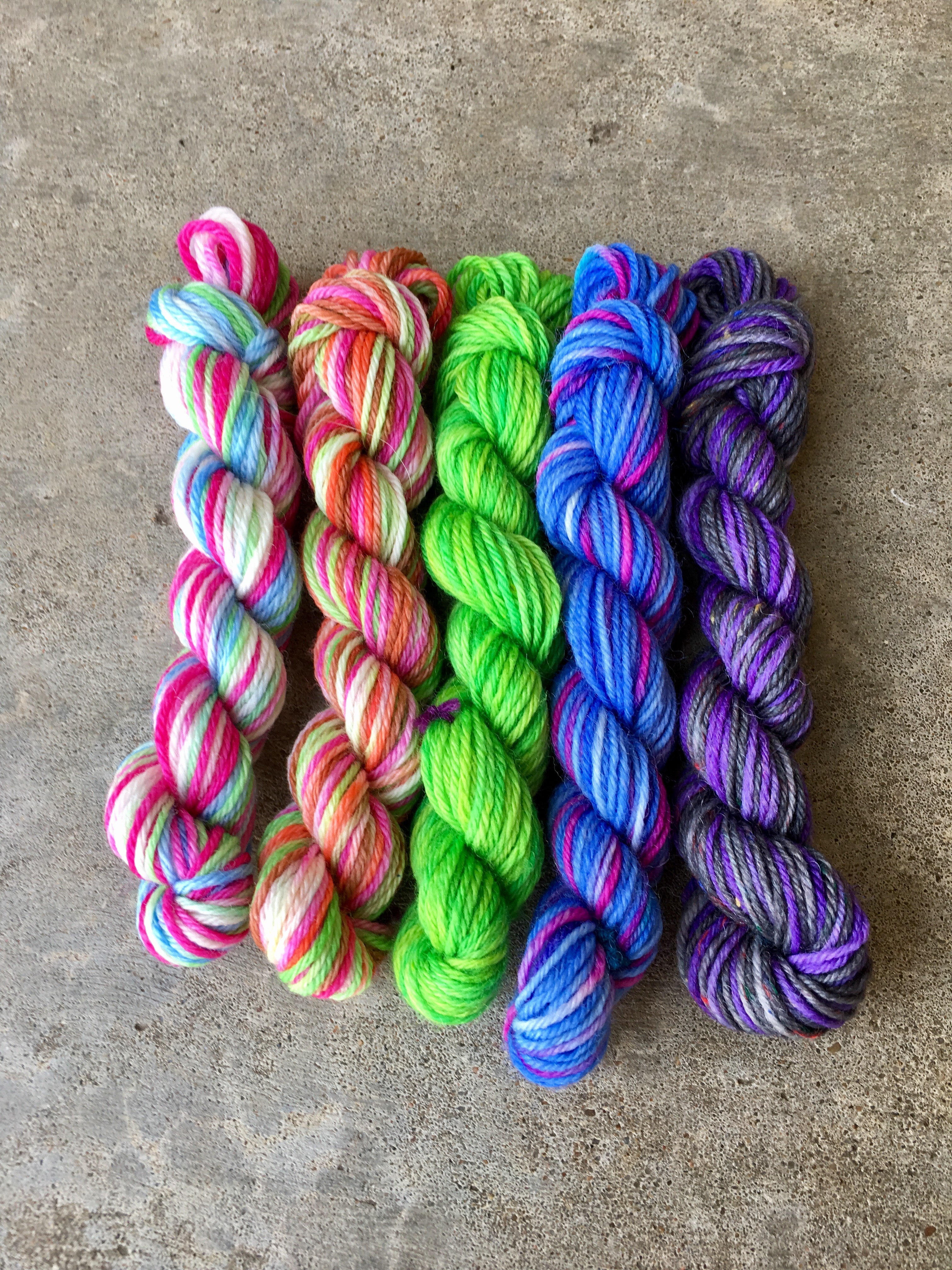 First, a set of Harry Potter inspired mini skeins from The Sexy Knitter. I have met Sarah in person several times now. She is such a bright and bubbly person and a blast to talk about knitting with. She has been putting one of a kind (OOAK) indie dyed mini skeins in her Etsy shop for awhile. I had resisted on Etsy but couldn’t pass them up in person. They are 25 yards each so I have roughly 100 yards here to add to my sock yarn memory blanket.