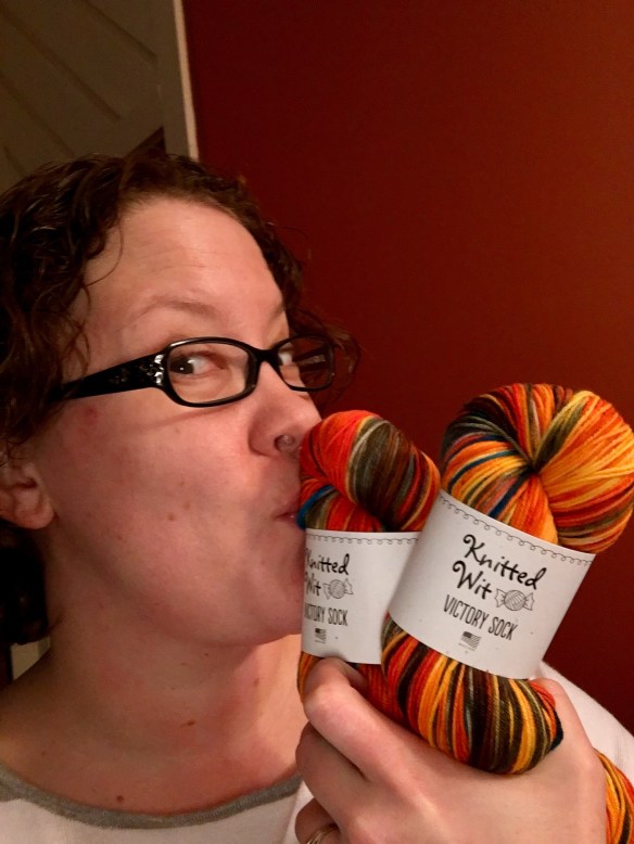 She sent me two skeins of beautiful Knitted Wit Victory Sock in the Fiesta color. When I opened the package I sent her this photo…