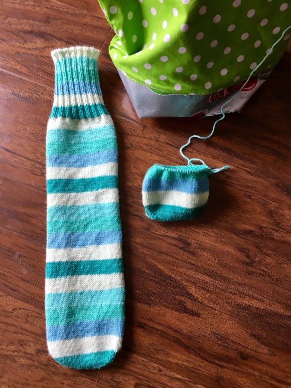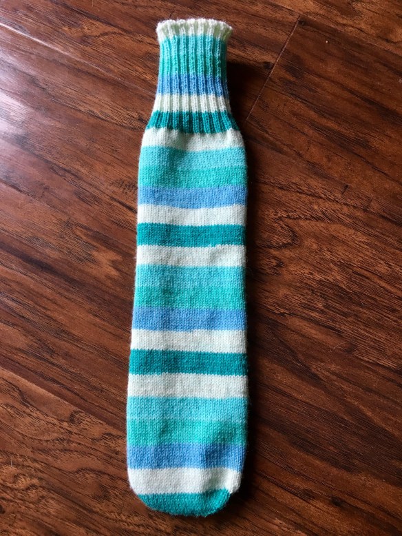 There she is, a true tube sock at this point. No waste yarn for heel placement. I still don’t have the trace of my sisters foot and the knitting was going so fast I didn’t want to stop. This sock is done and ready for heel placement. Once I get the measurement it should be alright given that I have good light, sharp needles and no toddler distraction…