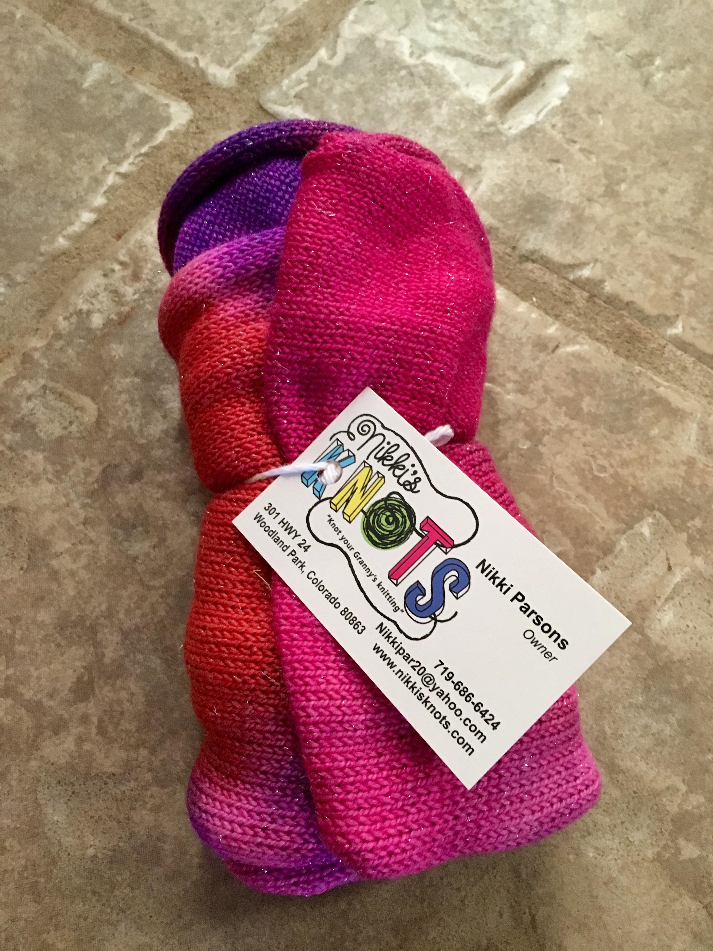 For Mother’s day I picked up a skein of Hansen Hand Dyes Mega Merino. Â That whopper of a skein had 820 yards of yarn in it. And despite working it into my Nangou and Terribly Simple I still have a TON of yarn left. And a light bulb went off….I could make finger-less mitts to match both shawls!