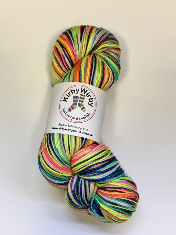 The hubby and I recently celebrated the big 1-0 wedding anniversary. We had a weekend away in Kansas City that involved BBQ, baseball and no 6 am toddler wake up call. He also told me to pick out a skein of yarn and he would buy it for souvenir yarn. (He knows the importance of such a thing.) Well we didn’t have any shops open nearby so of course I hit Etsy. I had seen that KirbyWirby had put a few OOAK skeins up and guys…..I grabbed one!