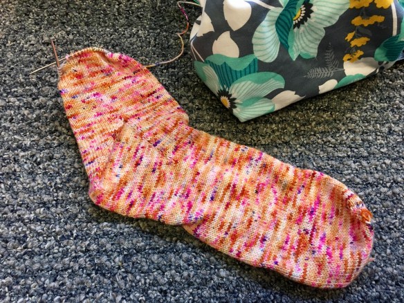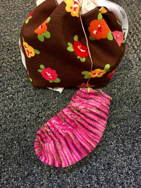 My Strands of Drunken Watermelon socks are still living in my desk. The foot now measures 7 inches. The pattern said to insert your favorite short row heel. But A) I converted these to toe-up and B) I don’t know any short row heels for toe up off the top of my head. I briefly flirted with short row heel patterns on Ravelry but ultimately I couldn’t bring myself to pull the trigger. I just decided to work a standard toe up gusset heel. I can continue the pattern over the top of the foot and do my increases in stockinette in the bottom. My brain knows how to do that so that’s what I’m doing.