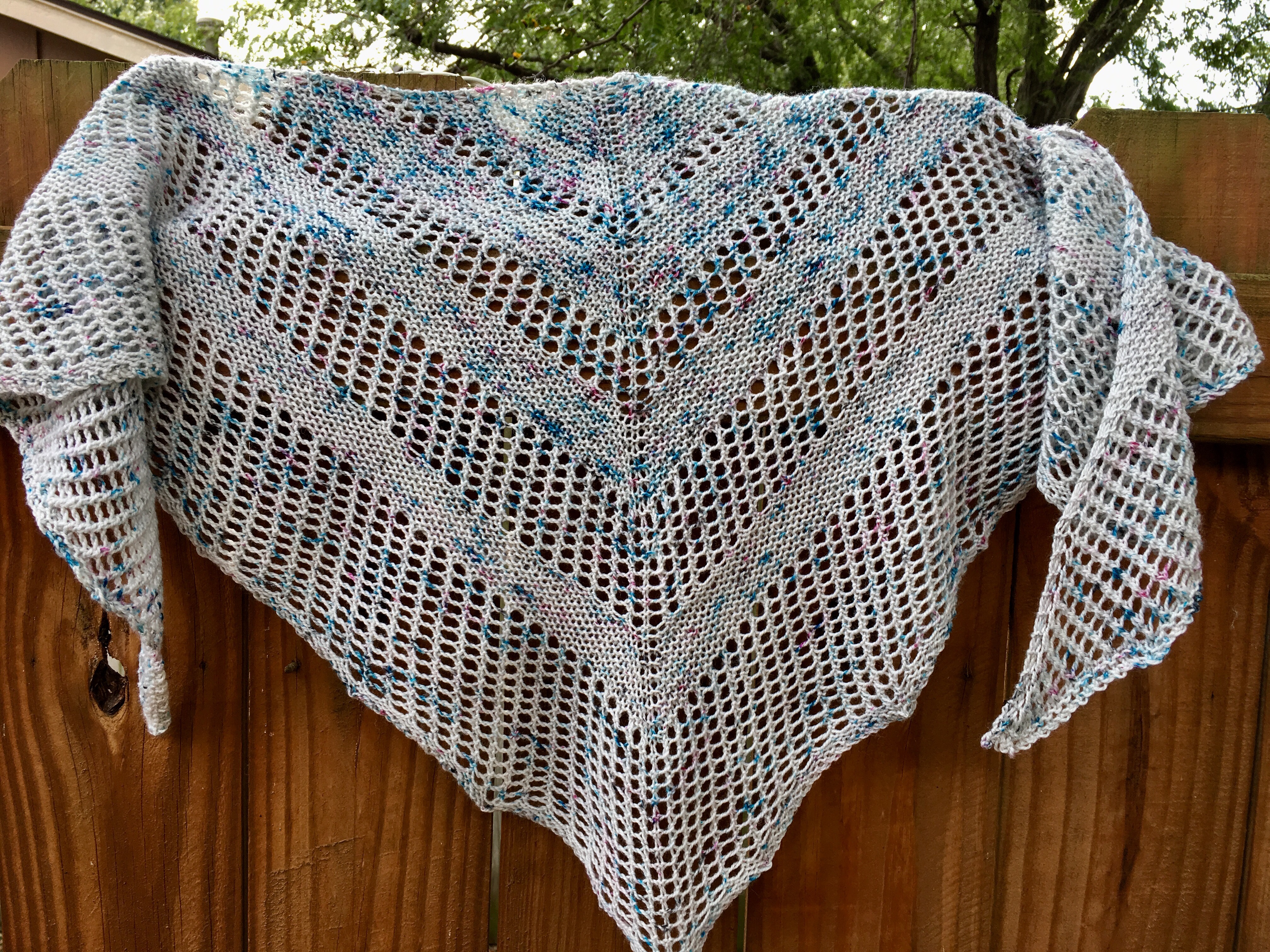 I washed and blocked this in just under two hours thanks to the late September Kansas heatwave and my husband’s fan. I don’t have blocking wires and you can see where I placed my pins. But I don’t care…it’s all mine now! I cannot wait for fall to when I can wear this beauty out and about! This project really has kicked my knitting mojo into high gear. On to the next thing!!!