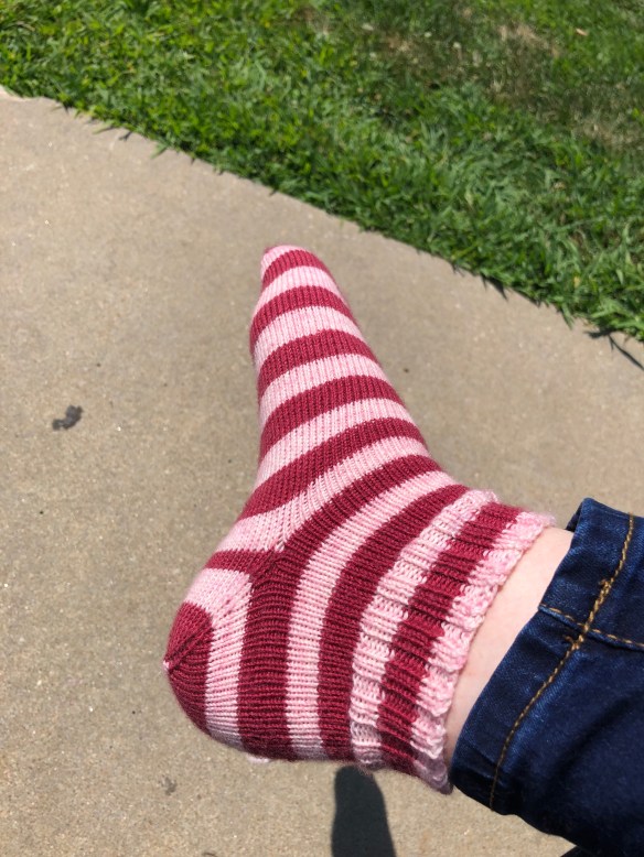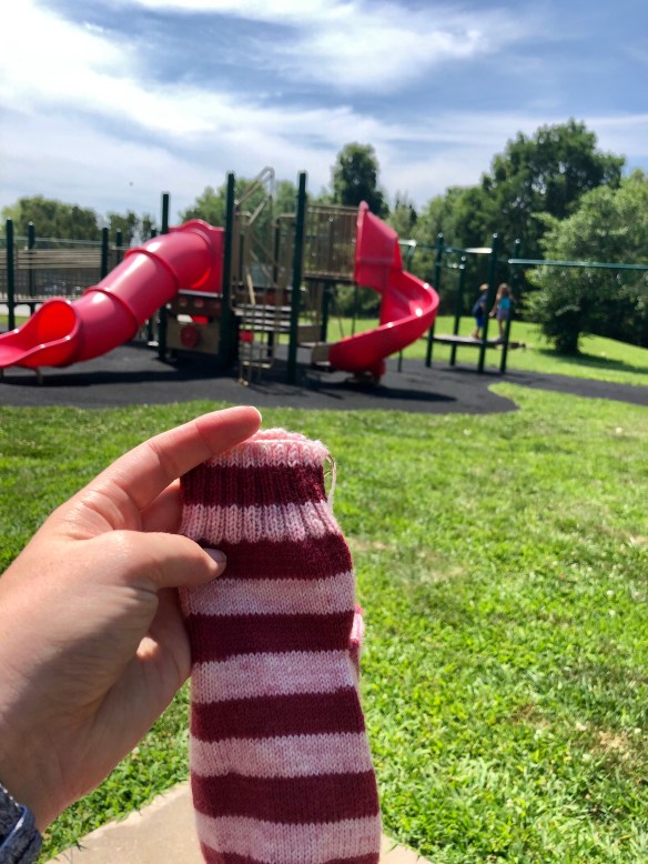 I chaperoned Jellybean on a play date this past week. It’s in the high 80s to low 90s (Fahrenheit) here in Kansas, so with the aid of a breeze we got some wiggles out at a local park. I of course brought my knitting….my Cheery Vanilla Socks were ready to cast off!