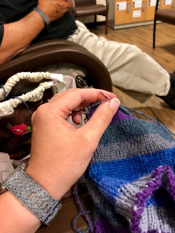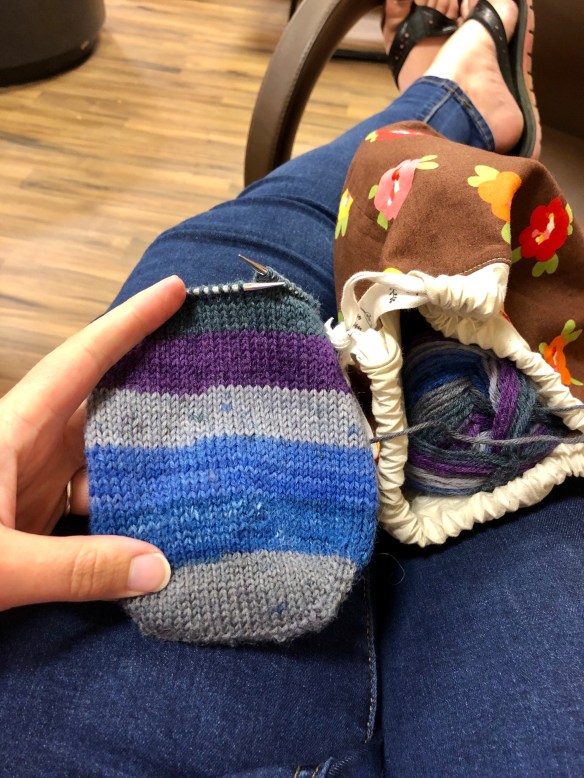 By the end of the day I was SORELY uncomfortable in the waiting room chairs. I had managed to snag my dad the one recliner in the room so he could put his feet up and take a rest. But I had managed to put six stripes into the foot of sock number two. I only have two more stripes and I will place the waste yarn for the heel.