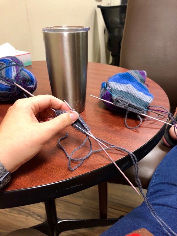 My mother recently underwent a surgical procedure that left my dad and I kicking around the hospital for the better part of 11 hours. The procedure was preventative in nature and went really well. She is sore and slowly on the mend albeit a little grumpy at the slowness of healing. I was a little nervous for her so I made sure to pack my knitting. (Full disclosure….I brought two whole sock projects “Just In Case” that I managed to finish the first set of socks).