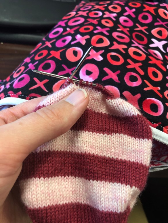By the end of the day I was SORELY uncomfortable in the waiting room chairs. I had managed to snag my dad the one recliner in the room so he could put his feet up and take a rest. But I had managed to put six stripes into the foot of sock number two. I only have two more stripes and I will place the waste yarn for the heel.