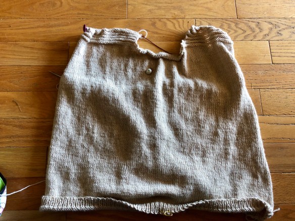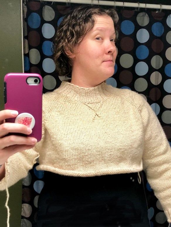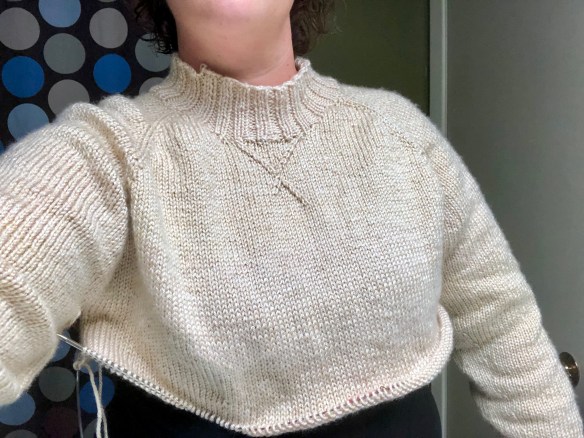 It looks sloppy and when I try it on, the weight of the sweater pulls ALL of the roll out of the collar so it’s just a big chuck of stockinette. And my tension got wonky in a couple of places and I may not have picked up in the cleanest fashion. It all just look Homemade instead of Handmade.