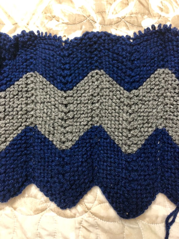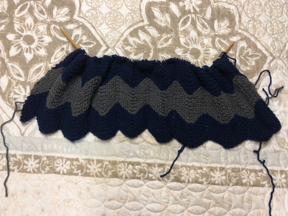 This time I cast on nine pattern repeats for a total of 144 stitches. I’m MUCH more happy with this version. Now I’m working through my navy and grey stripes until I use half of those colors by weight.