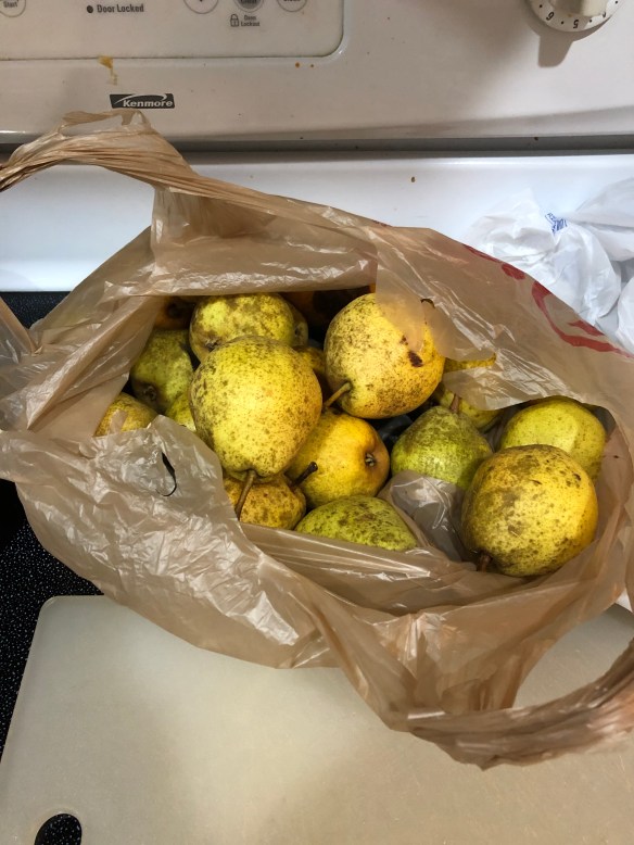 My neighbor has a pear tree that was LOADED this year. I managed to be the recipient of two grocery sacks of pears this fall. I managed to get the bulk of them ripe at the same time and decided to make pear jelly.