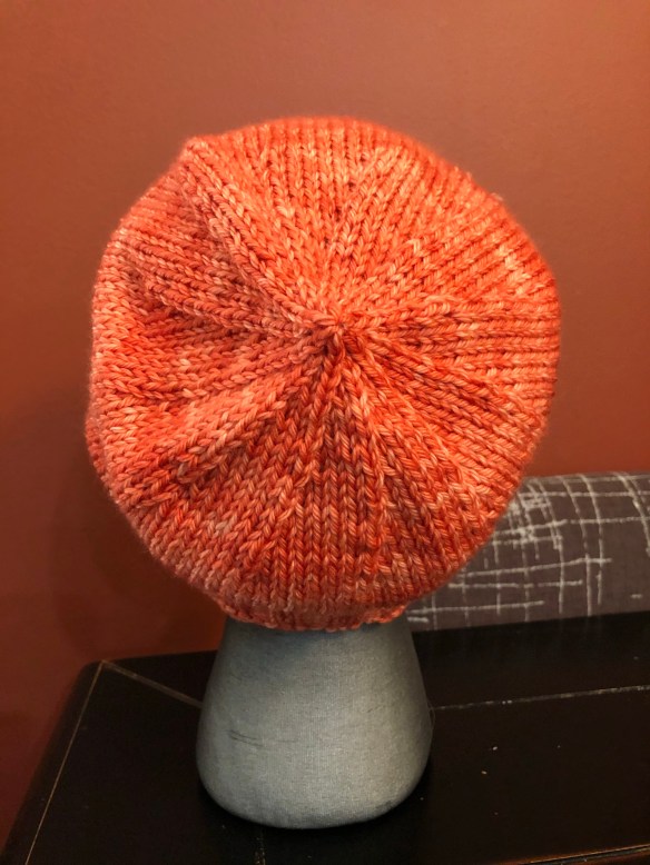 The crown decreases did come out a little nipple like at the very top. I haven’t decided if it bothers me or not. I can always throw a pom pom on it if I decide that it does. I used up about 155 yards of the 185 yard skein. So just about 85%. I’m guessing I could have eked out a few more rows before the crown decreases but I didn’t want to play yarn chicken. I tucked the leftover in my bin for a scrappy project or future hat repair.