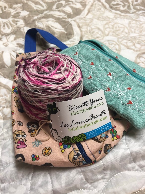 My sock needles have been conspicuously empty. I was in need of a simple vanilla project for some travel/meeting knitting so I went rummaging in my stash. I have had this Biscotte Yarns Bis-sock self-striping wound up for way too long. But it was ready to go so I pulled my size 0 needles out and hit the road.