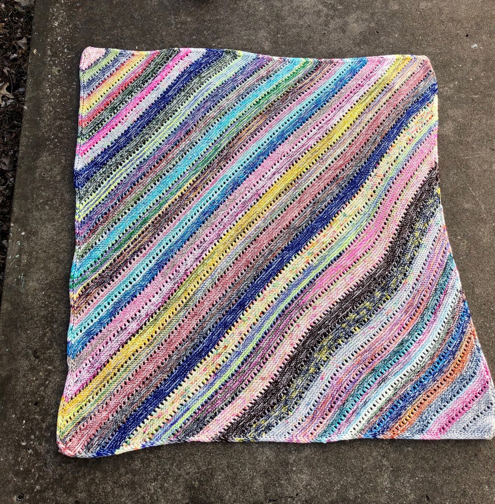 This project just ticked all the boxes for me and I’m almost tempted to cast on another one! It was very to memorize and easy to read where I was when I put it down mid repeat. It used up a TON of scraps from my stash. When I weighed this behemoth it weighed 822 grams. Based on some maths I did based on the average sock yarn statistics….this blanket used rough 3,300 yards of yarn!