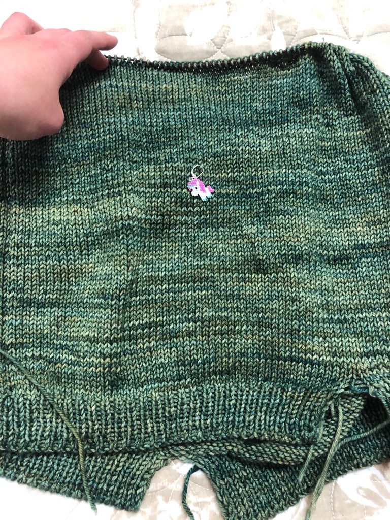 My project has been made even cheerier by the unicorn stitch marker ala Hannah of the Corner of Craft. I have knit maybe three to three and half inches of body since I last blogged about this. I’m going to move my marker and keep knitting the body.