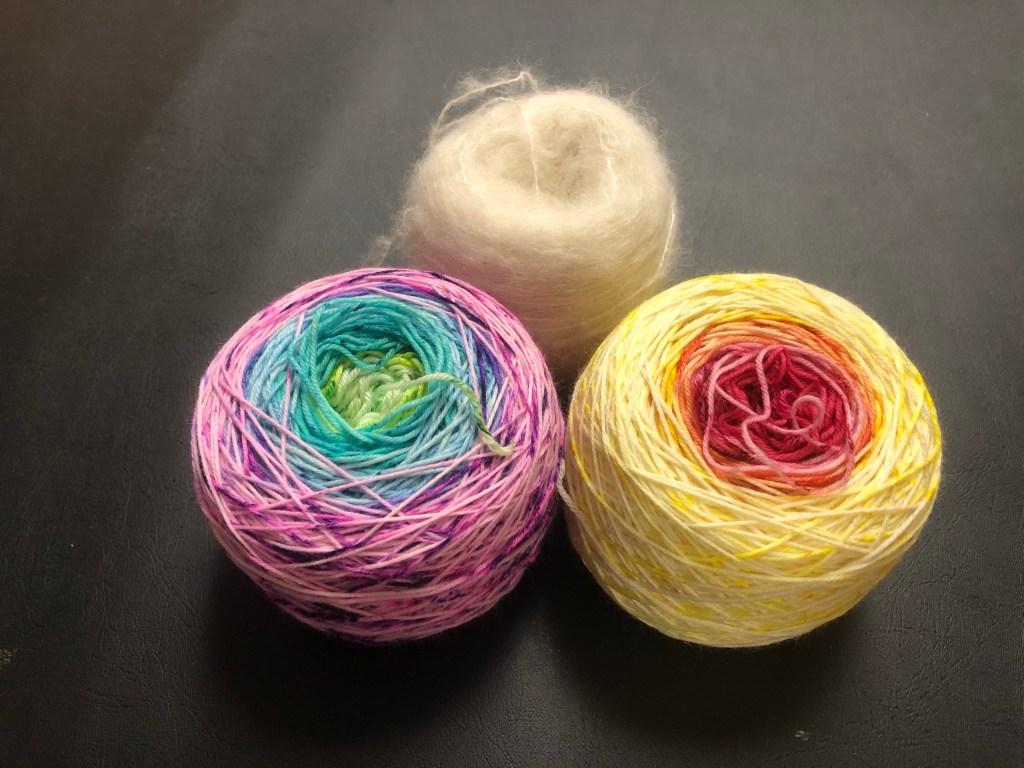 They came in a full spectrum rainbow in 12 minis, so I used my swift and ball winder to wind them into two equal cakes of six colors. I used a loose knot to connect the colors but I will russian join them when I get to the actual knitting. I also spied some leftover Suri Alpaca that I might work into the blanket. I’m considering using it a separation between the rainbow colors OR holding it double with the sock yarn on just the eyelet rows to provide some visual interest. I have some thinking to do on that one.