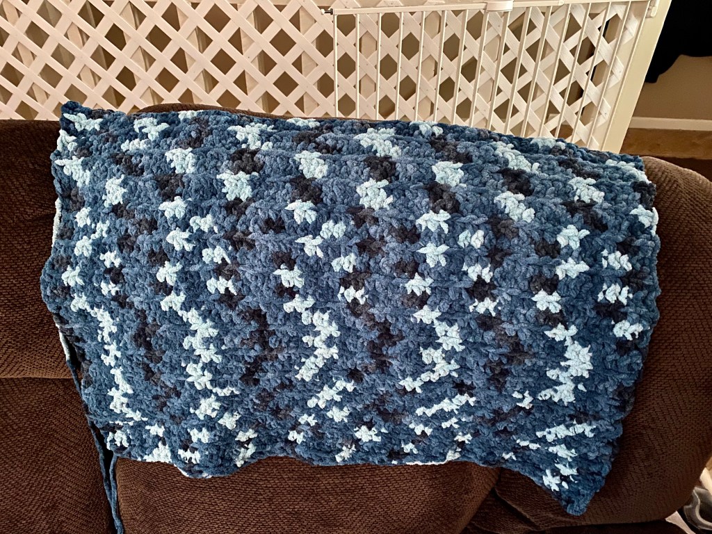 I am having to warm up my crochet muscles a bit. This is super bulky yarn and a big hook so I have to take breaks to avoid soreness and injury. But so far I have crocheted through the first skein of Bernat Blanket and I’m starting the second.