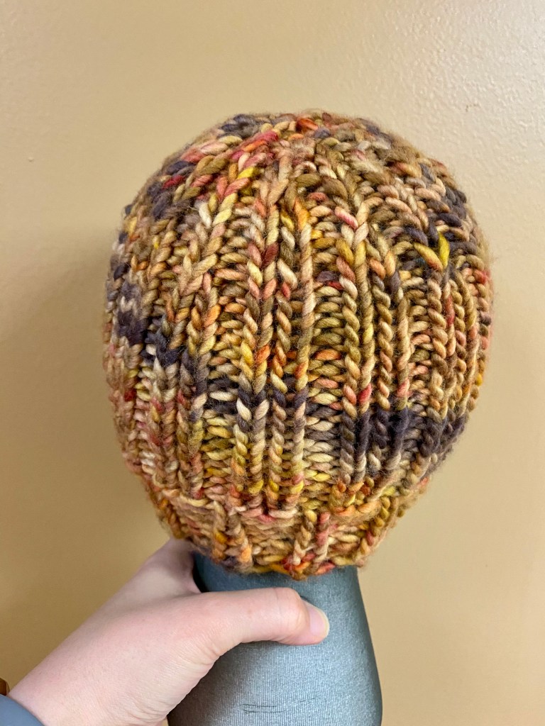 Tah dah!! I have a finished super speedy bulky knit hat. I completed my Big Comfy Chunky Hat in own hand dyed Feast yarn by Nomad Yarns.