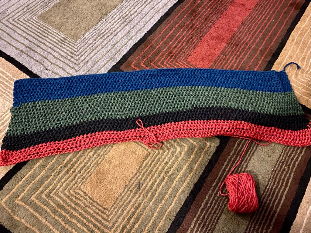 I have finished the first stripe of royal blue and forest green as they were both full skeins. I then made a skinny striped of black just for whimsy and now I’m adding a full skein of ruby red. I think I think I will add the rest of the black on the other side of the red followed then by another full skein of the forest green. I will still have three skeins of yarn left after completing that pattern.