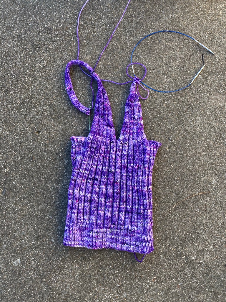 I am SOOO close to finishing this long languishing “sweater”. My DK Ripple Bralet is down to the one last strap.