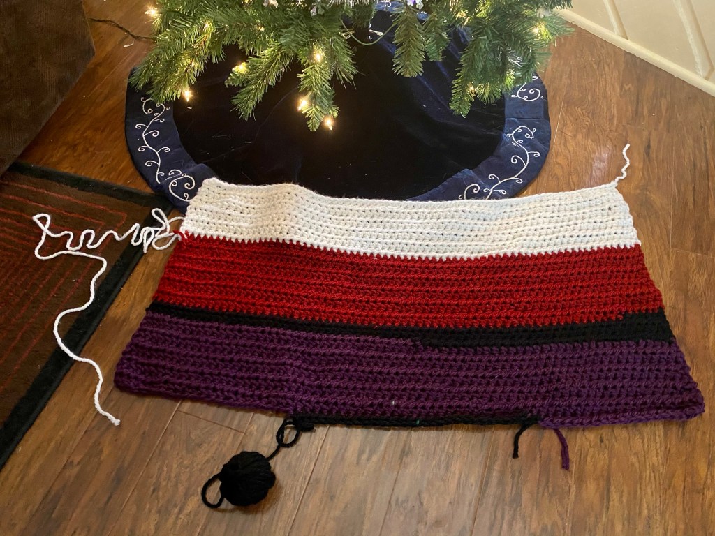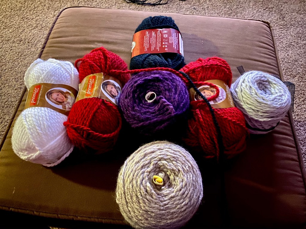 The black skein is a partial skein so I think I will split it equally in half and put between the red and purple. But I’m feeling good about this lineup. I think this is just enough yarn to make a nice car sized lap blanket for my grandmother.