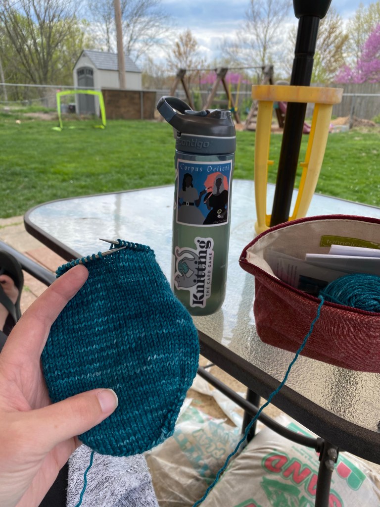 I had lemonade, shade, knitting and a podcast in my ears. It was far too fleeting but enjoyable. I managed roughly three inches of sock foot redo after I had ripped all the way back to the toe. Its amazing how fast DK sock yarns works up compared to fingering weight, lol.