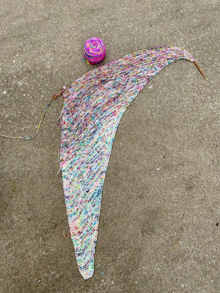 I had a few Zoom meeting this last couple of days where I wasn’t presenting or having to talk very much. And you know what? That is great for garter stitch knitting! In roughly two days of meeting and after bedtime knitting I am poised to add the third and last color to my In The Light (pink version)!