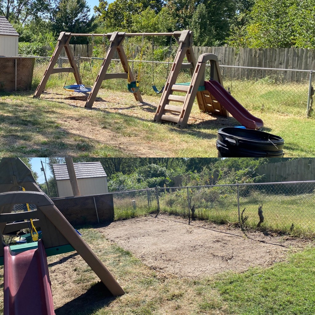 So we ripped out and bagged up the surface. We are going to put up an outdoor storage shed similar to our neighbors. And then do some tilling and plant grass in a few weeks to get some hopefully good fall growth. At this point I am willing to mow around the play set as it will be far less work.