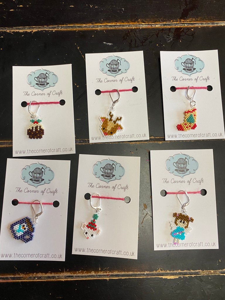 I do have plans to use the stitch markers. I am really gravitating to the earring back clasp stitch markers as my go-to. They can easily go from stitch marker to progress keeper and back. I think my favorite is the snowman mug of cocoa.
